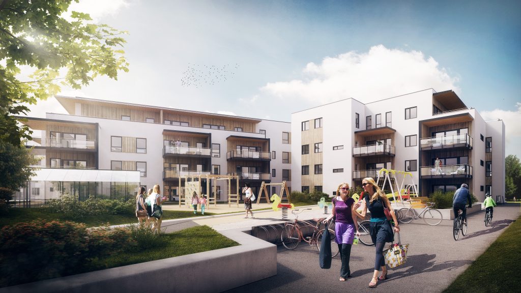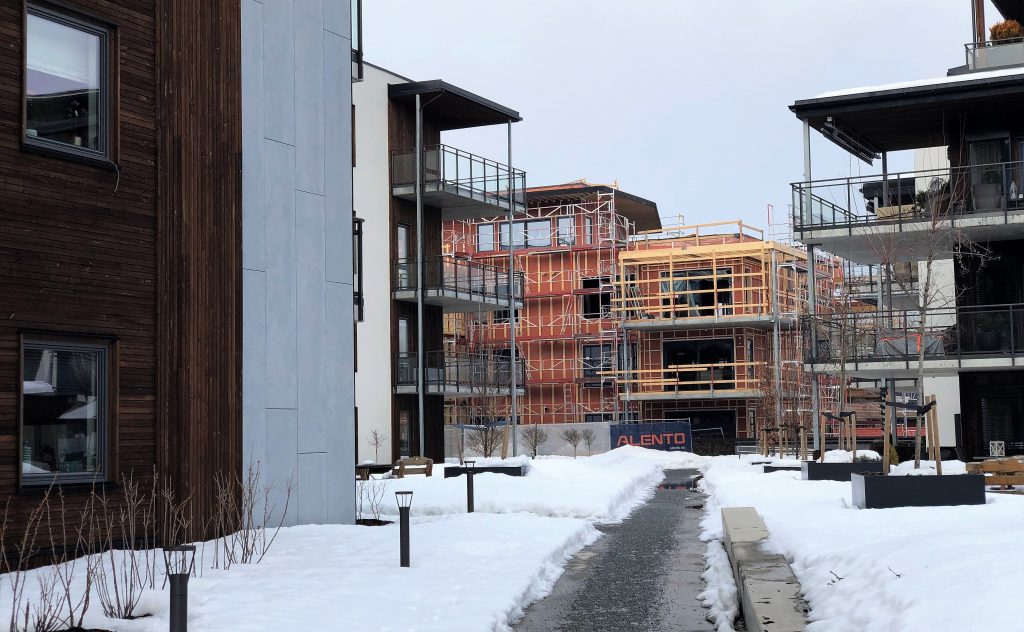 Det er allerede folksomt og et yrende liv inne på de naturlige tunene mellom leilighetsbyggene, og kvartalet har blitt en slags liten landsby med sine snart fem bygninger tett samlet midt i kommunesenteret. Sluttresultatet ser flott ut, men for Fjerdingby er det viktigst at det som ligger bakenfor veggene er av høyeste kvalitet.
